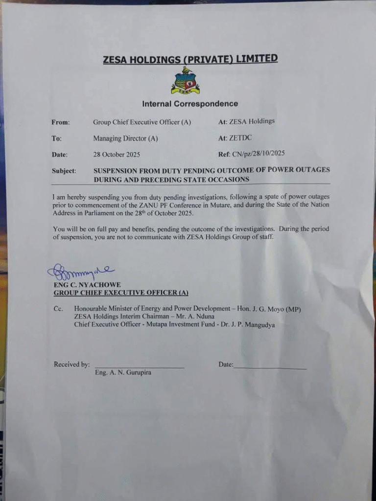 In the immediate aftermath, the Zimbabwe Electricity and Distribution Company’s Managing Director Abel Gurupira was suspended without hesitation. His career appears to have been sacrificed to contain the political fallout. According to an internal memo, his removal was done amid an investigation into the blackout, yet the speed and ferocity of the decision scream of panic more than process. Energy Minister July Moyo and Zesa’s group chief executive Cletus Nyachowe acted quickly after pressure mounted from both Mnangagwa and Speaker of Parliament Jacob Mudenda, who was furious and reportedly threatened a backlash if the matter was not handled swiftly.